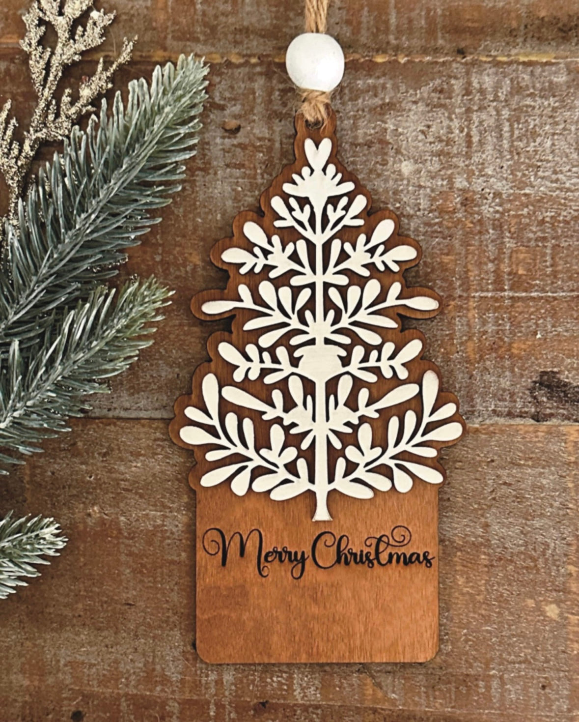 Add a touch of handcrafted charm to your holiday décor with this beautifully layered wooden Christmas tree ornament.